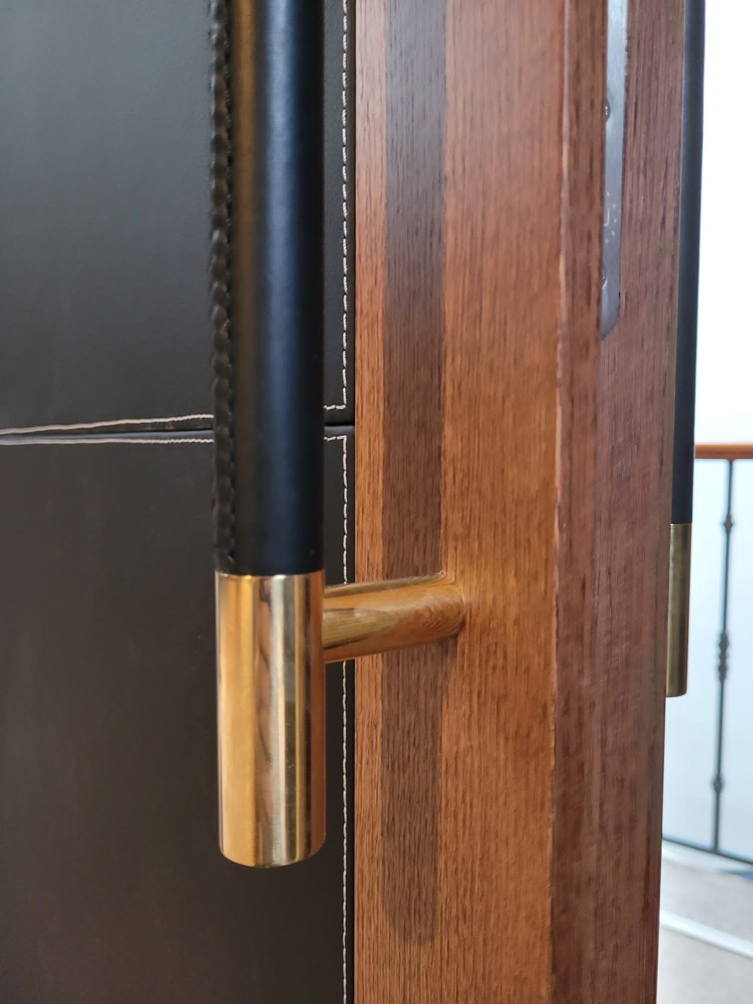 Nous avons soigneusement conçu un bar courbé doté d’un élégant plateau en céramique. La jupe, subtilement réalisée en panneaux cintrés recouverts de demi-ronds en noyer US massif, intègre un ruban LED qui sublime la courbe harmonieuse du bar.