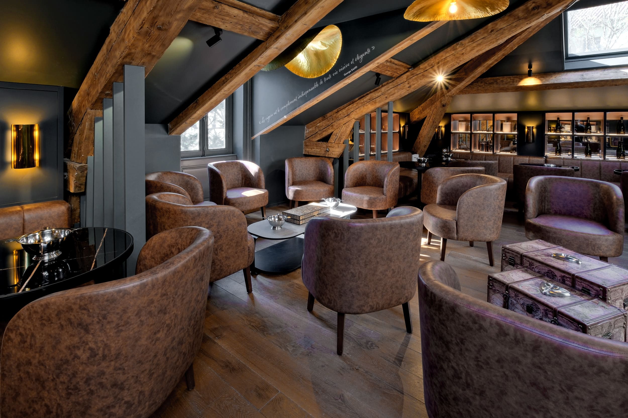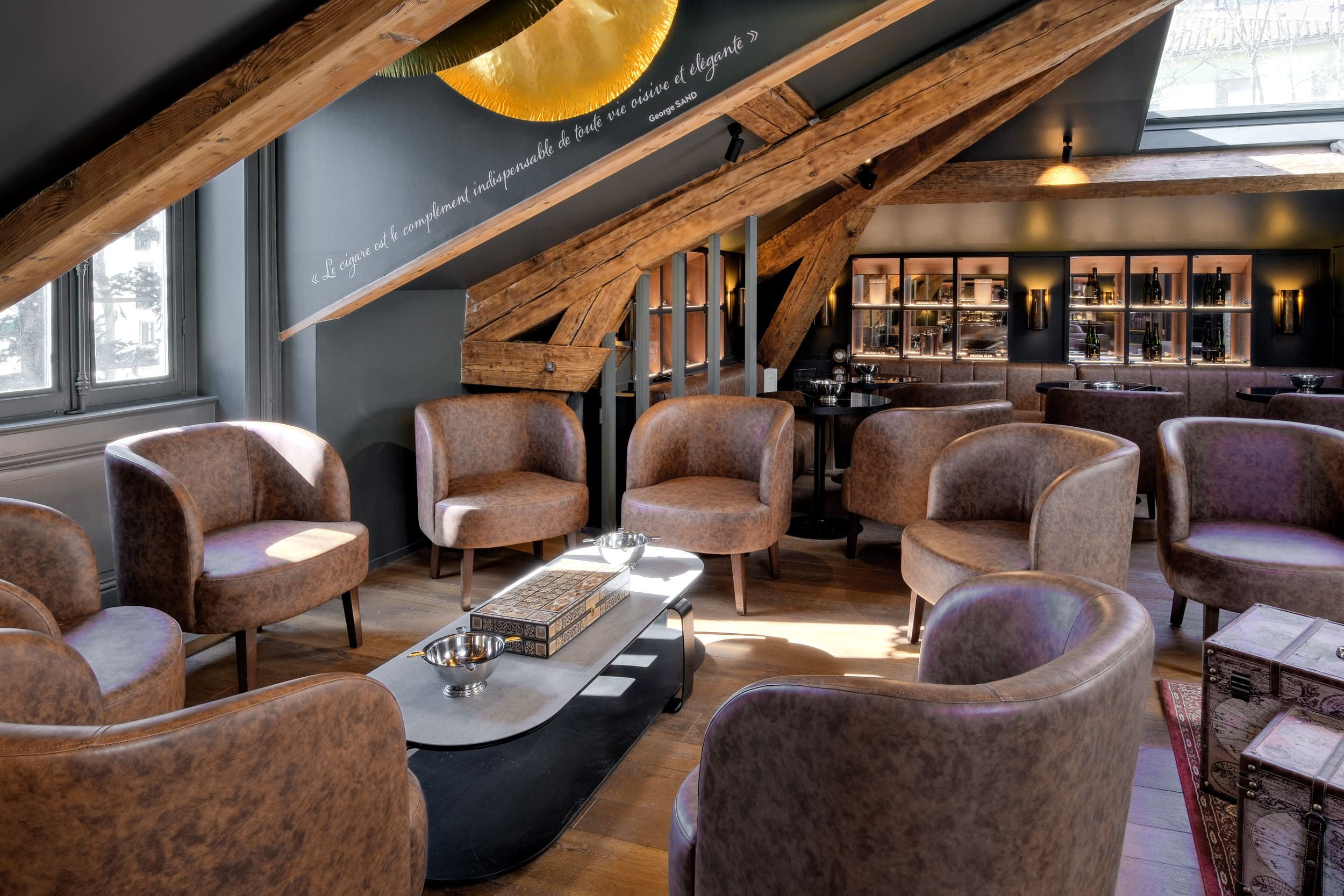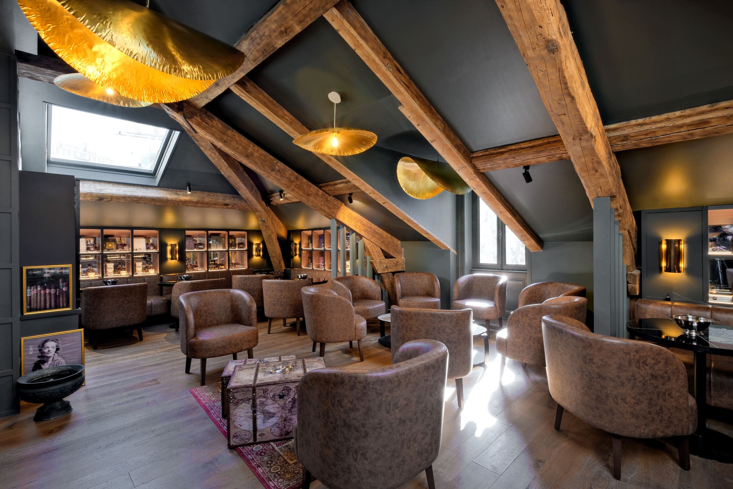 Le Fumoir George réserve une expérience inédite à ses membres, dans une ambiance feutrée au pur style londonien. Vous pourrez y admirer des claustras en bois massif sous la belle charpente, ainsi que les habillages muraux.