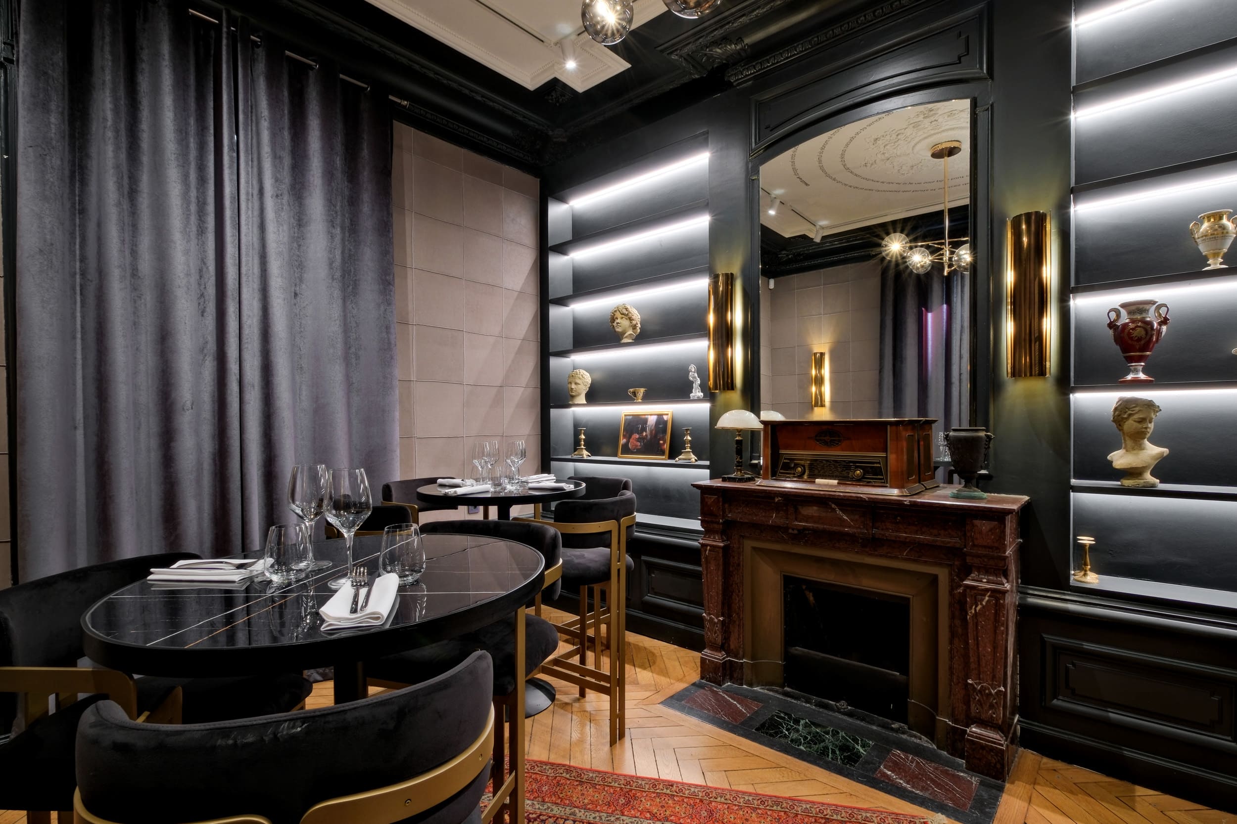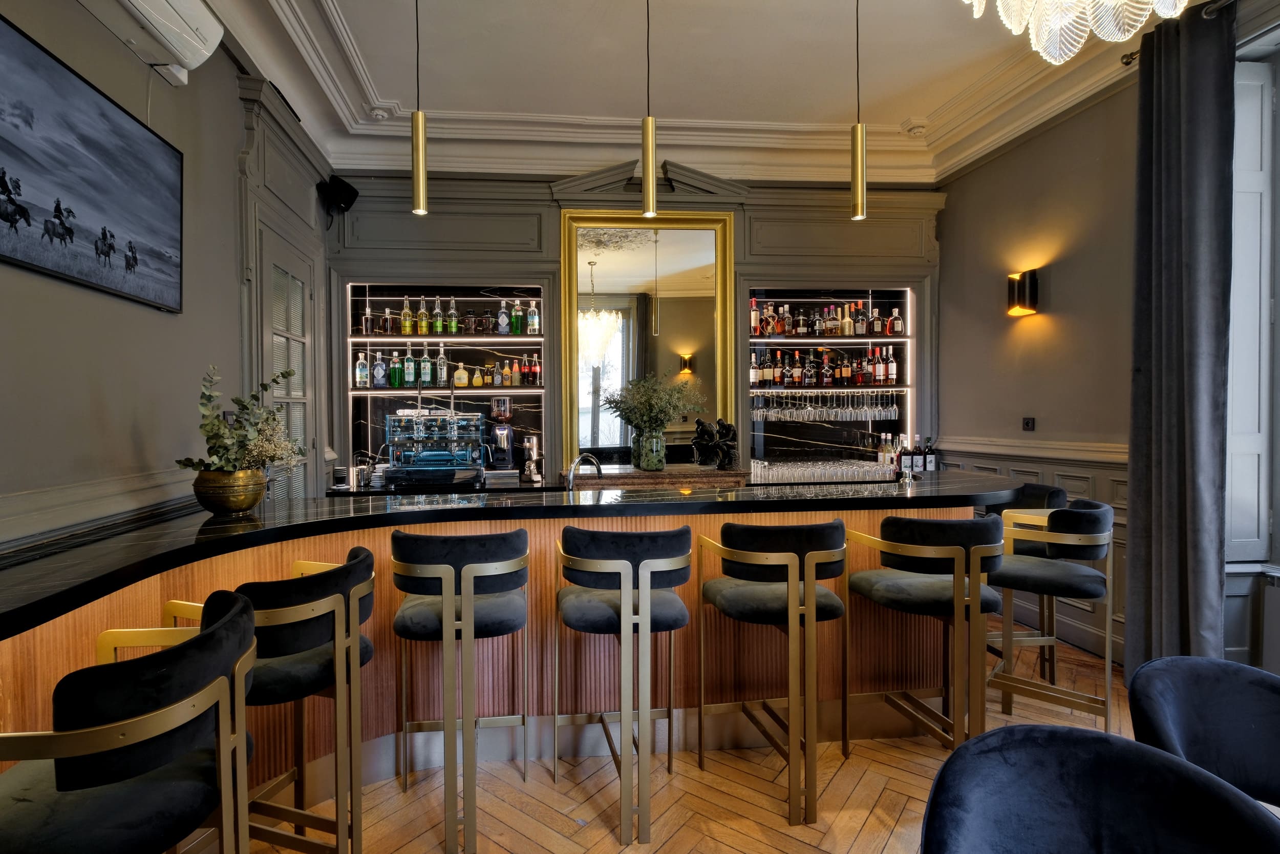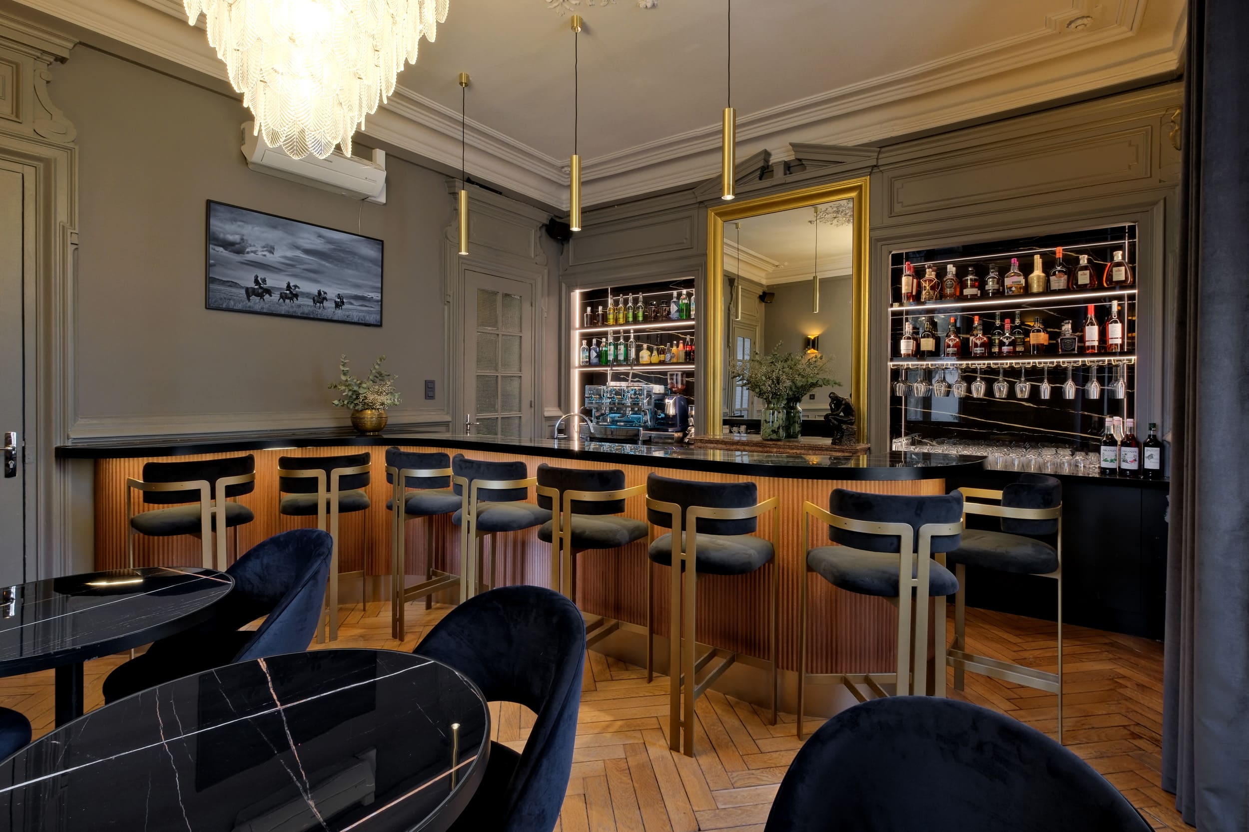 Le bar de Lou vous accueille pour un petit déjeuner d’affaires, un repas assis ou un cocktail dans un espace lumineux et convivial grâce à son bar courbé et sa cheminée de marbre rouge.