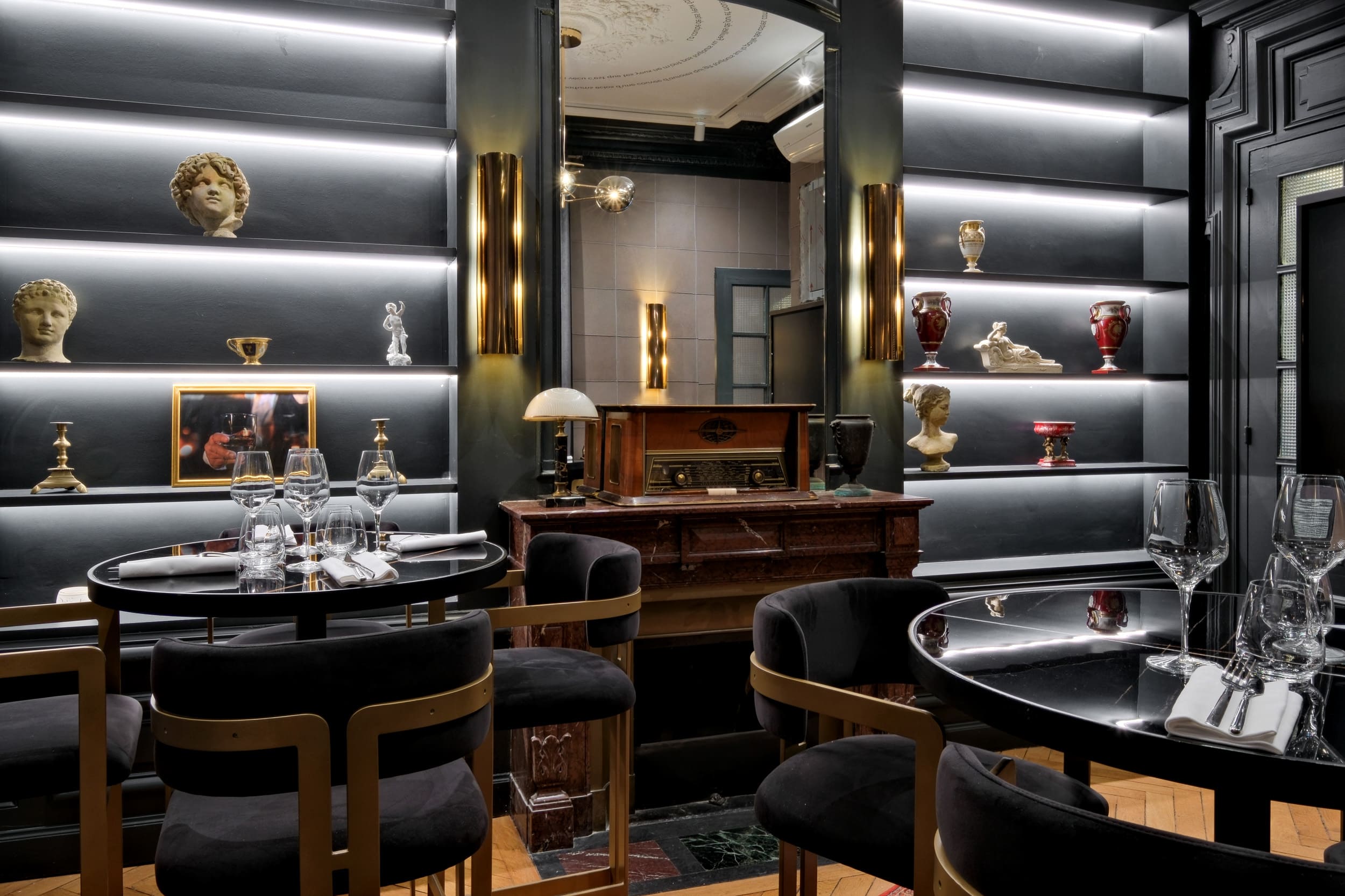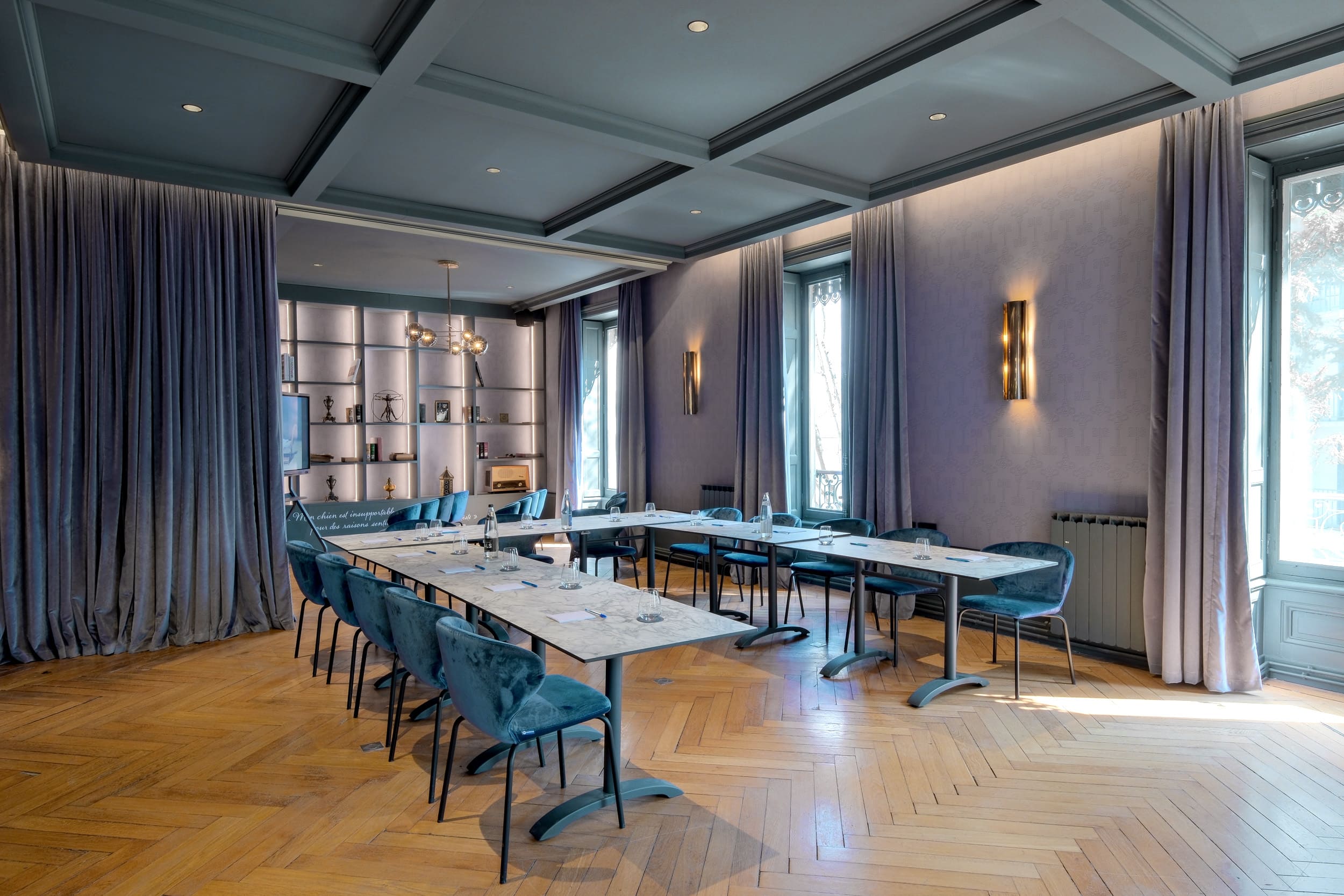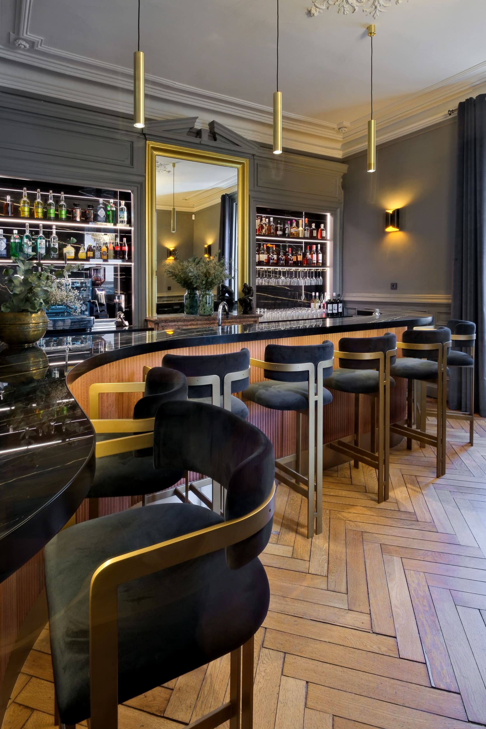 Le bar de Lou vous accueille pour un petit déjeuner d’affaires, un repas assis ou un cocktail dans un espace lumineux et convivial grâce à son bar courbé et sa cheminée de marbre rouge.